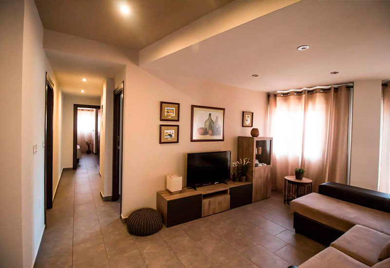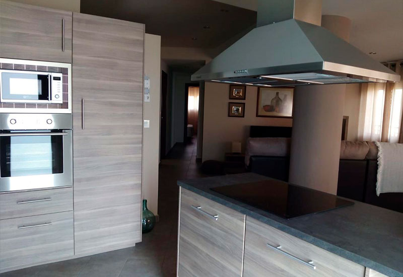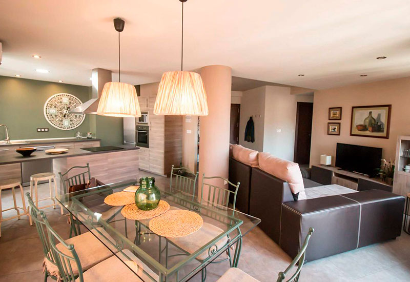El apartamento cuenta con 3 dormitorios (uno de ellos con baño privado), 2 baños con bañera o ducha, un salón-comedor espacioso y una cocina moderna con isla central equipada con lavavajillas, microondas, horno y cafetera. Además, dispone de WiFi gratuita, aire acondicionado, TV de pantalla plana y reproductor de DVD.